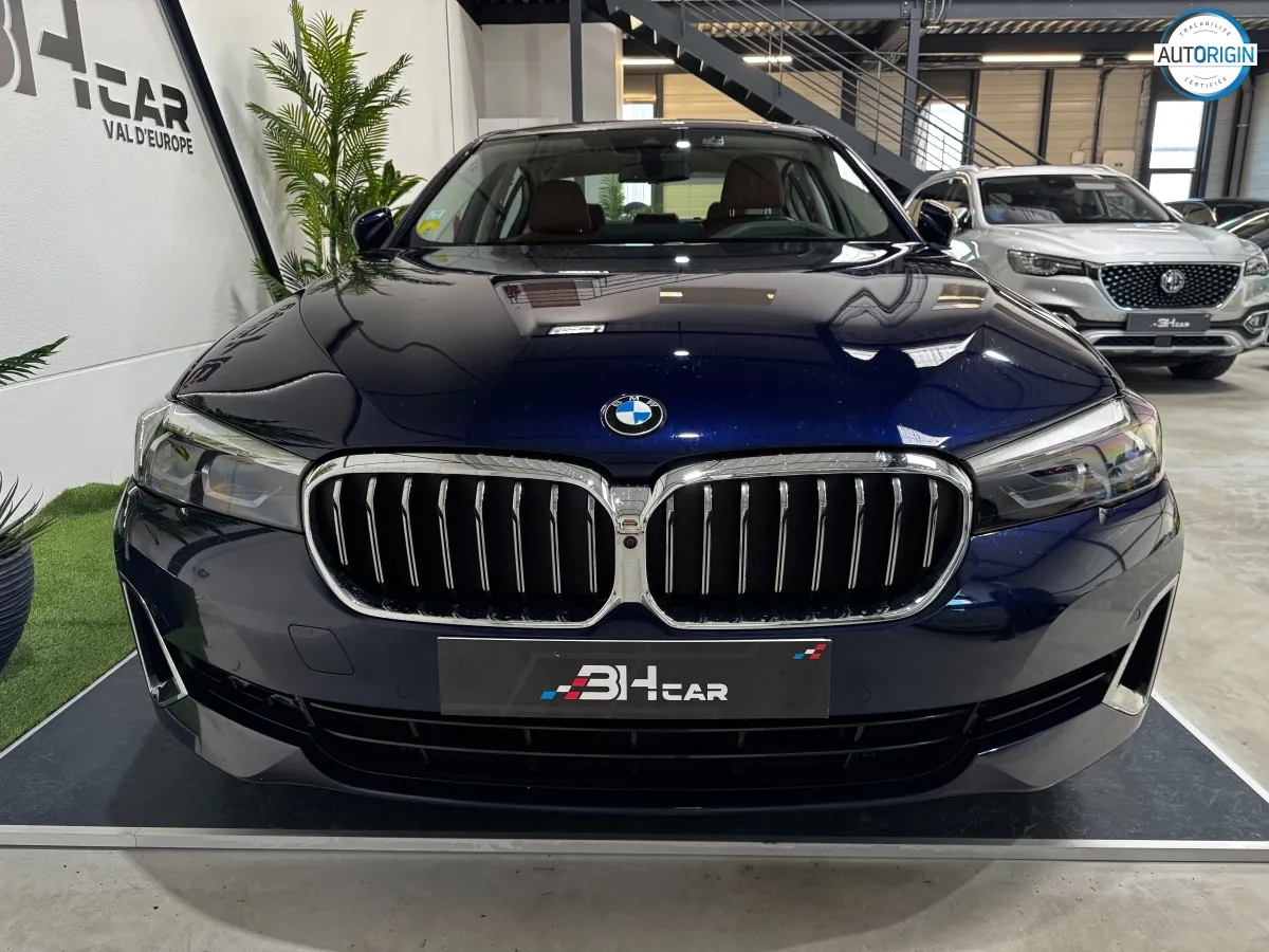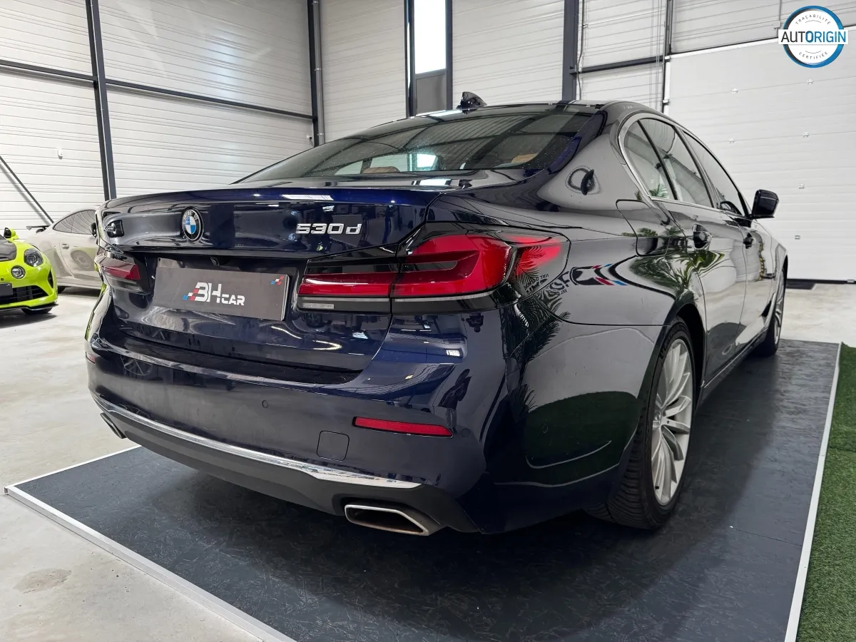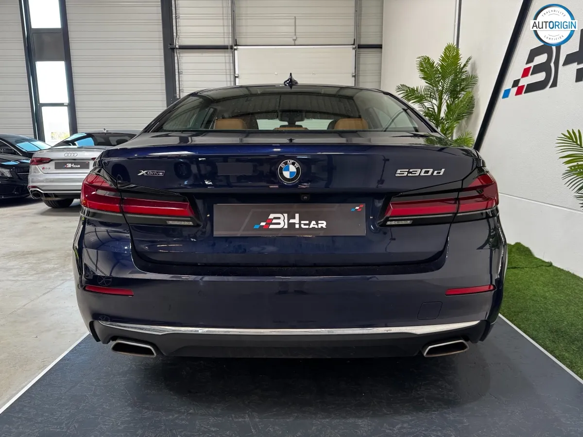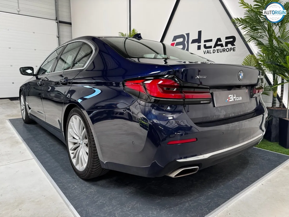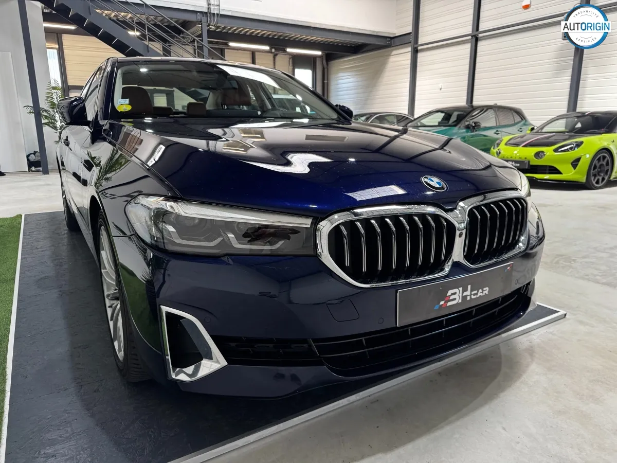 BMW Série 5 530d xDrive en excellent état, très bien optionnée, en plus d'un combo couleurs particulièrement désirable. Cet exemplaire associe la transmission intégrale, le groupe motopropulseur mild hybrid 48V et un niveau d'équipements très complet : train arrière directeur, sièges massants, caméra 360°, Driving Assistant Professional, pack hiver et bien d'autres.